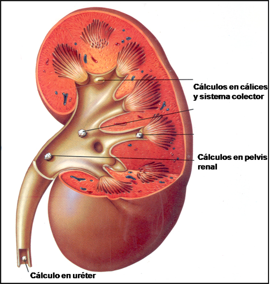 Los Cálculos Renales es una enfermedad causada por la presencia de cálculos o piedras en el interior de los riñones o de las vías urinarias (uréteres, vejiga). Los cálculos renales se componen de sustancias normales de la orina, pero por diferentes razones se han concentrado y solidificado en fragmentos de mayor o menor tamaño.